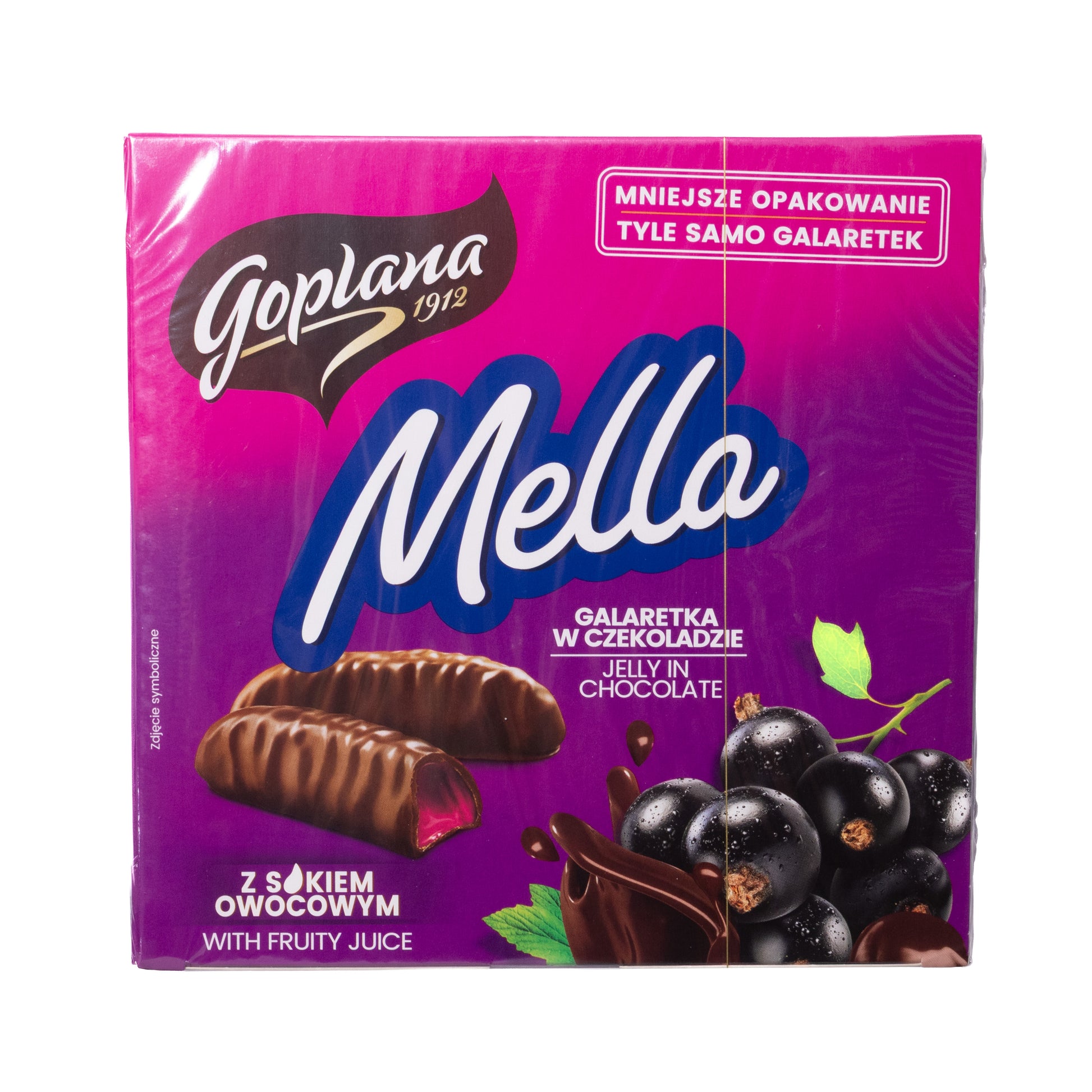 Goplana Mella Blackcurrant Jelly in Chocolate brings the classic Polish favorite galaretka w czekoladzie to life with a deep, fruity blackcurrant center and a smooth chocolate coating. Each piece delivers that signature contrast: a gentle chocolate snap, then a bright, juicy jelly that melts cleanly on the palate.