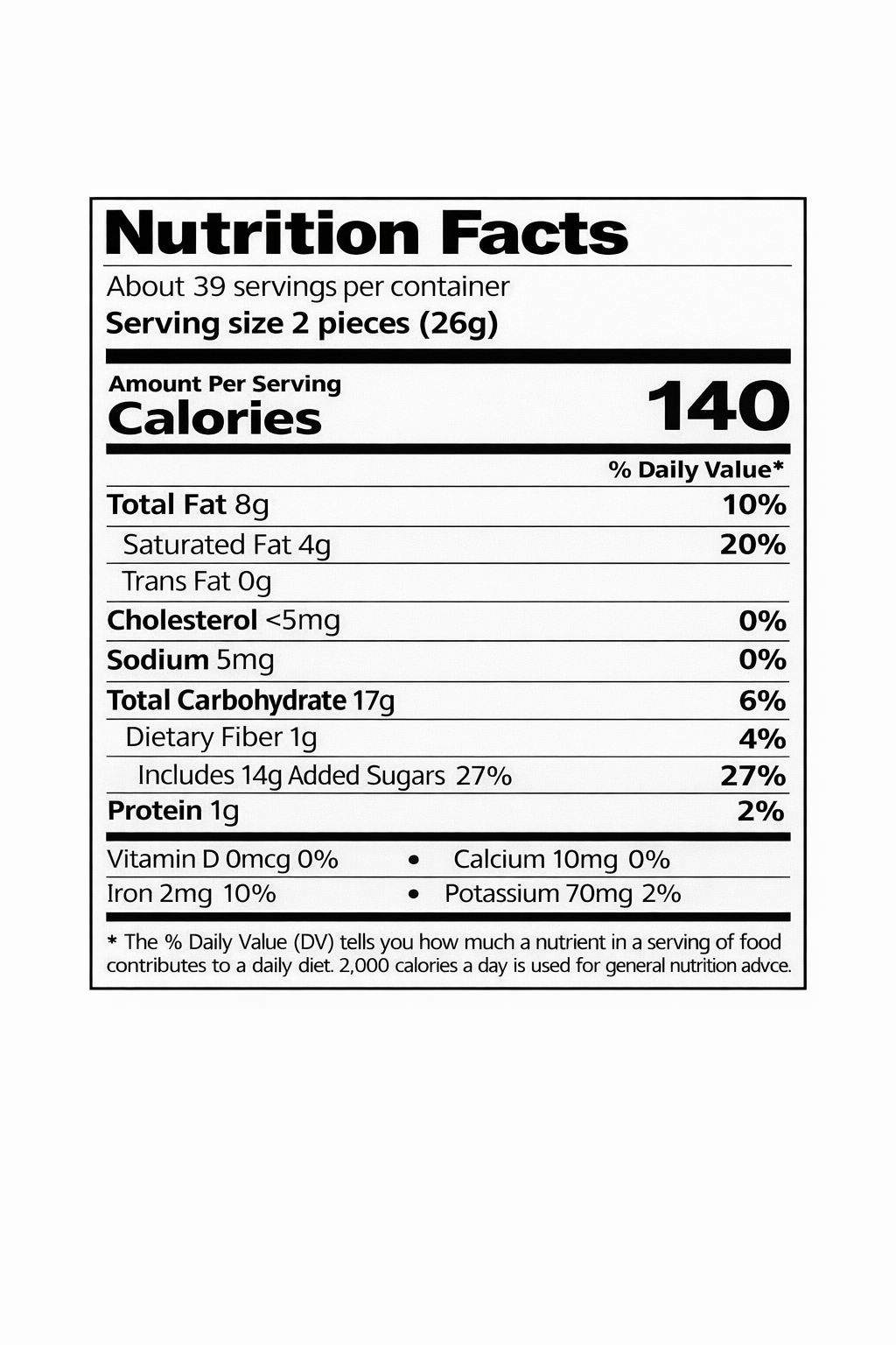 Ingredients: sugar, vegetable oils (palm, shea, palm kernel, sunflower), cocoa mass (solids and paste), wheat flour, fat-reduced cocoa powder, roasted almonds, roasted hazelnuts, cocoa butter, soy lecithin (emulsifier), polyglycerol polyricinoleate (emulsifier), artificial vanilla flavoring, skimmed milk powder, leavening agents ( sodium hydrogen carbonate, ammonium hydrogen carbonate), salt, chocolate coating (sugar, cocoa mass (solids and paste), cocoa butter, shea oil, soy lecithin (emulsifier), polyglycerol polyricinoleate, artificial vanilla flavoring). Contains tree nuts (hazelnuts and almonds), soy, milk, gluten (wheat). May contain: peanuts, sesame seeds, egg.